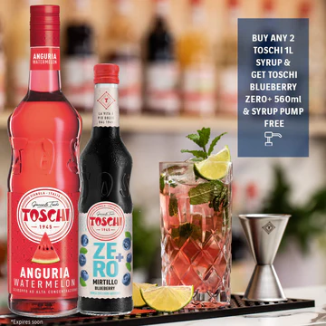 Buy any 2 Toschi 1L Syrup get 560ML Blueberry FREE